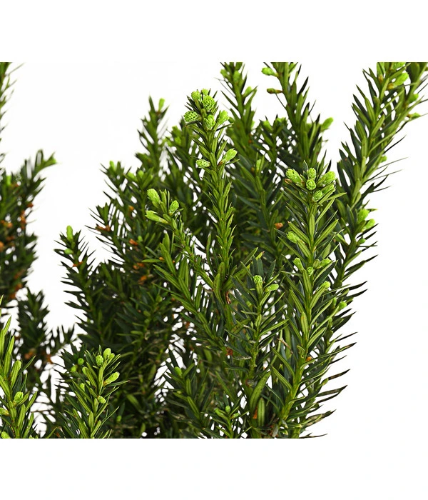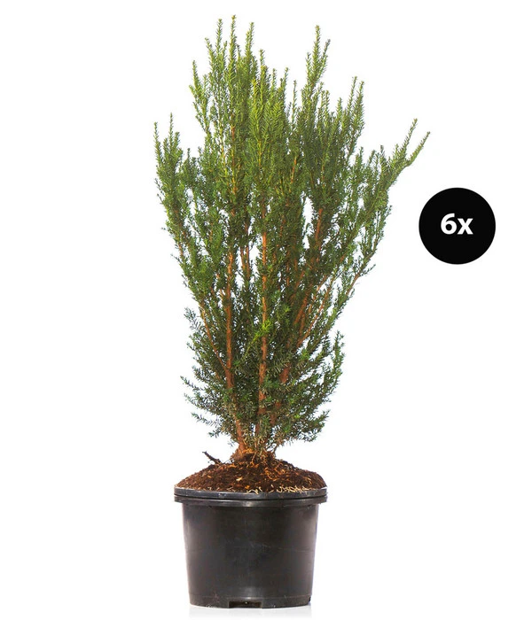 Der eine sucht Heckenpflanzen zur Einfriedung eines großen Gartens, ein anderer sucht einen eindrucksvollen Solitär, der sich als Formschnittgehölz in einem Gartenbeet oder sogar in einem Kübel in Szene setzen wird. Wenn beide von einer Pflanze träumen, die ein wunderschön immergrünes Nadelkleid mit einem unkomplizierten Charakter verbindet, werden beide mit großer Wahrscheinlichkeit bei einer Becher-Eibe ‘Hillii‘ landen. Denn bei dieser Eibensorte handelt es sich um einen echten Tausendsassa, der eine Gartenanlage auf verschiedenste Weise bereichern kann. Denn diese Bechereibe verfügt über einen besonders aufrechten, pyramidalen Wuchs, der ideal für hohe, aber nicht zu breite Hecken ist. Da es eine männliche Zuchtform ist, werden außerdem im Herbst keine giftigen roten Beeren Tiere und Kinder in Versuchung führen. Deshalb haben wir aus 6 dieser wunderschönen, kräftigen Pflanzen ein Set gebildet, das eine ca. 3 Meter lange Eibenhecke bilden kann. Haben Sie schon einen Platz für die Becher-Eibe ‘Hillii‘ im Blick? Dann lassen Sie die Pflanzen gleich dort Platz nehmen!