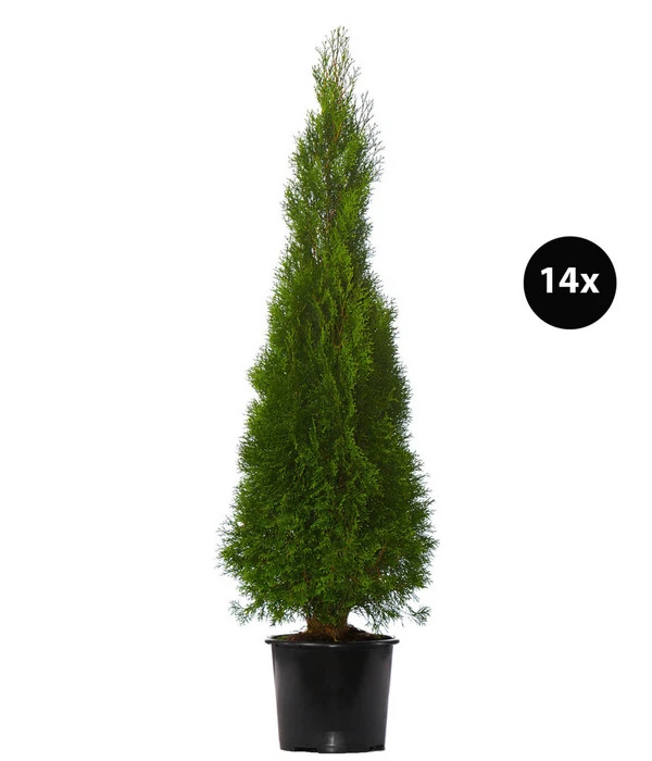 Sie haben Ihren Garten nach allen Regeln der Gartenkunst angelegt und die Pflanzen entwickeln sich prächtig. Jetzt fehlt nur noch eine Hecke, um dem Ganzen einen dekorativen Rahmen zu geben und Ihnen ein gewisses Maß an Privat-Sphäre zu garantieren. Und Sie wissen auch schon eins: Es soll eine Hecke aus Thuja-Pflanzen werden, denn deren Sicht-, Wind- und Lärmschutz ist verlässlich dicht und immergrün. Wenn Sie außerdem nicht viele Jahre warten möchten, bis die grüne Wand in die Höhe gewachsen ist, könnte dieses Pflanzenpaket das Richtige für Sie sein: 14 gesunde, kräftige Pflanzen Lebensbaum ‘Smaragd‘, die bereits eine stattliche Höhe 150-175 cm haben. Also gleich Pflanzlöcher ausheben, die Thuja occidentalis einsetzen und sich an dem wunderschönen Anblick erfreuen. Und dann wird es auch nicht lange dauern, bis erste Vögel Ihre Hecke Lebensbaum ‘Smaragd‘ als Nistplatz und Kinderstube entdecken!