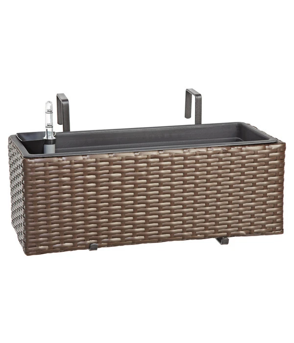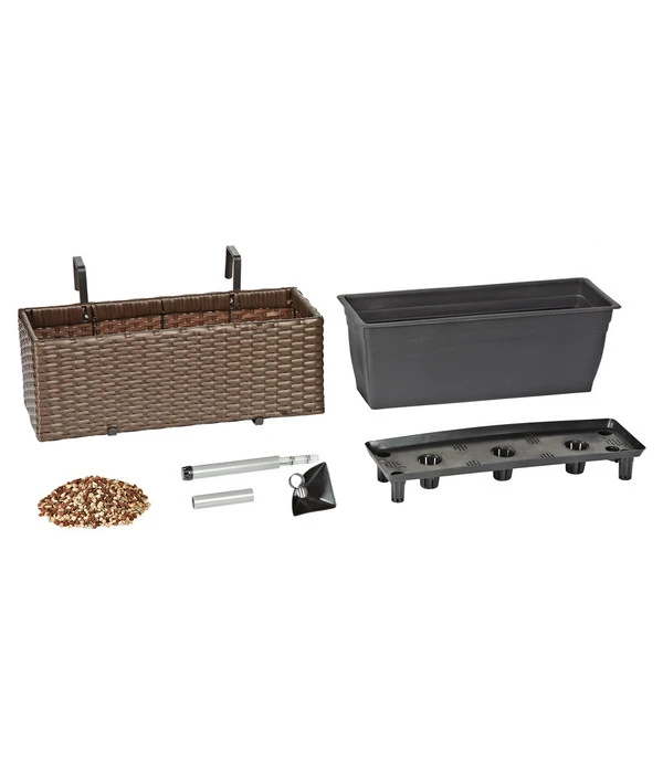 Der ansprechende Kunststoff-Balkonkasten Florenz von Dehner verbindet ein zeitloses, schickes Design in moderner Flechtoptik mit optimaler Funktionalität. Letztere ist durch das integrierte, nützliche Bewässerungssystem des Blumenkastens gegeben. So bleiben Ihre Pflanzen lange frisch, ohne dass Sie – gerade im Sommer – mehrmals täglich nachgießen müssen. Der rechteckige Balkonkasten wird inklusive Granulat zur Befüllung und zweier Kastenhalter geliefert, mit denen sich das Pflanzgefäß ideal am Balkongeländer befestigen lässt. Das widerstandsfähige Material des Kunststoff-Balkonkastens Florenz des Labels Dehner Markenqualität Freizeit macht den Pflanzkübel zu einem praktischen Gebrauchsgegenstand, den Sie selbst im Winter auf dem Balkon oder im Garten belassen können. Er ist nämlich frostbeständig, solange Sie Staunässe im Inneren des Kastens vermeiden. Hierfür empfiehlt sich eine wasserdichte Abdeckung mit Folie oder einem Holzbrett während der Wintermonate.