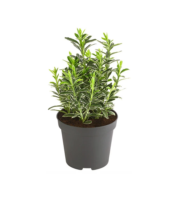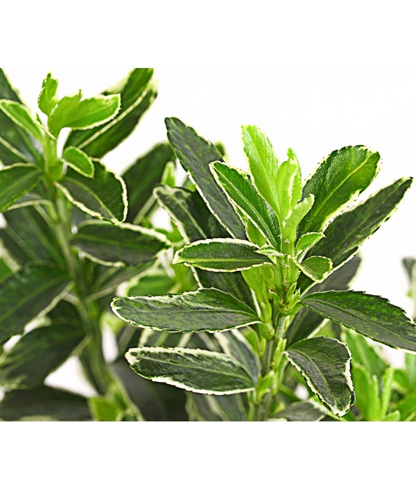 Der Strauch erreicht nur eine maximale Wuchshöhe von 30 cm, für die er sich auch gemütlich Zeit lässt, und doch weiß ein Kleinblättriger Kriech-Spindelstrauch auf sich aufmerksam zu machen. Japanische Spindelsträucher sind inzwischen fester Bestandteil vieler Gartenanlagen, doch die kleinblättrige Sorte ‚Microphyllus Albovariegatus‘ hat so wunderschön panaschiertes Laub wie nur wenige andere. Die kleinen, grünen Blätter sind nämlich von einem ziemlich breiten, strahlend weißen Rand umrahmt, der der Pflanze eine fröhliche Ausstrahlung mit auf den Weg gibt. Dadurch eignet sich ein Kleinblättriger Kriech-Spindelstrauch ‚Microphyllus Albovariegatus‘ so hervorragend für leuchtende Farbakzente zum Beispiel vor eher dunkelgrünen Eiben- oder Thuja-Hecken, er schmückt aber auch Kästen, Kübel, Tröge und Schalen mit seinem farbenfrohen Laub.