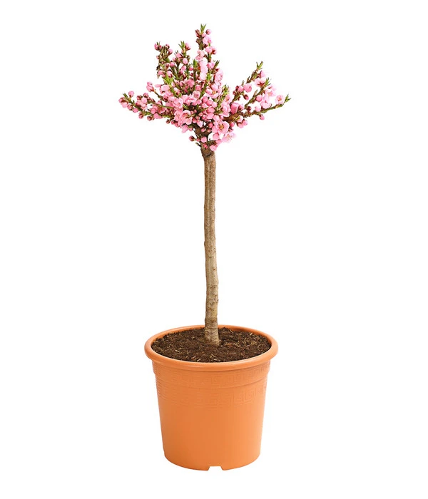 Mit ihrer angenehm glatten Haut und der fruchtigen Süße hat sich die Schwester des Pfirsichs einen festen Platz in unserem sommerlichen Obstangebot erobert. Auch Sie sind ein echter Fan und hätten gerne einen Nektarinenbaum im Garten, aber einfach zu wenig Platz? Mit der Zwergnektarine ‚Nectarella‘ kann Ihr Traum wahr werden, denn diese Sorte gibt sich mit einer Größe von 100-150 cm zufrieden. Dafür aber entwickelt sie einen riesigen Ehrgeiz, auf dieser Fläche so viel leckere Früchte wie möglich zu produzieren. Darüber hinaus verspricht das Nektarinen-Bäumchen nicht nur einen kulinarischen, sondern auch einen optischen Genuss. Im März/April nämlich verwandelt sich die Zwergnektarine ‚Nectarella‘ in einen intensiv rosafarbenen Blütentraum, der so manchem Zierstrauch den Rang als Blickmagnet streitig macht. Und von Juli bis September beschenkt Sie das Obstgehölz mit den saftig süßen Früchten, die mit ihrer appetitlich gelb-roten Schale zwischen dem grünen Laub leuchten. Gönnen Sie sich eine Zwergnektarine ‚Nectarella‘ – Sie werden viele Jahre Freude an ihr haben!